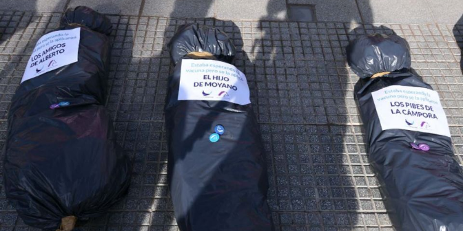 Un grupo de personas, enroladas en Unión Republicana colocó bolsas mortuorias con carteles que indicaban que se trataban de fallecidos por Covid que esperaban una vacuna que se había aplicado algún funcionario. El objetivo de la bolsa mortuoria era colocar bien grande el nombre del funcionario o la personalidad política. Incluso, colocaron el nombre de Estela de Carlotto, quien se vacunó conforme a su edad, y su nombre fue inscripto como metáfora siniestra de lo que querían representar.