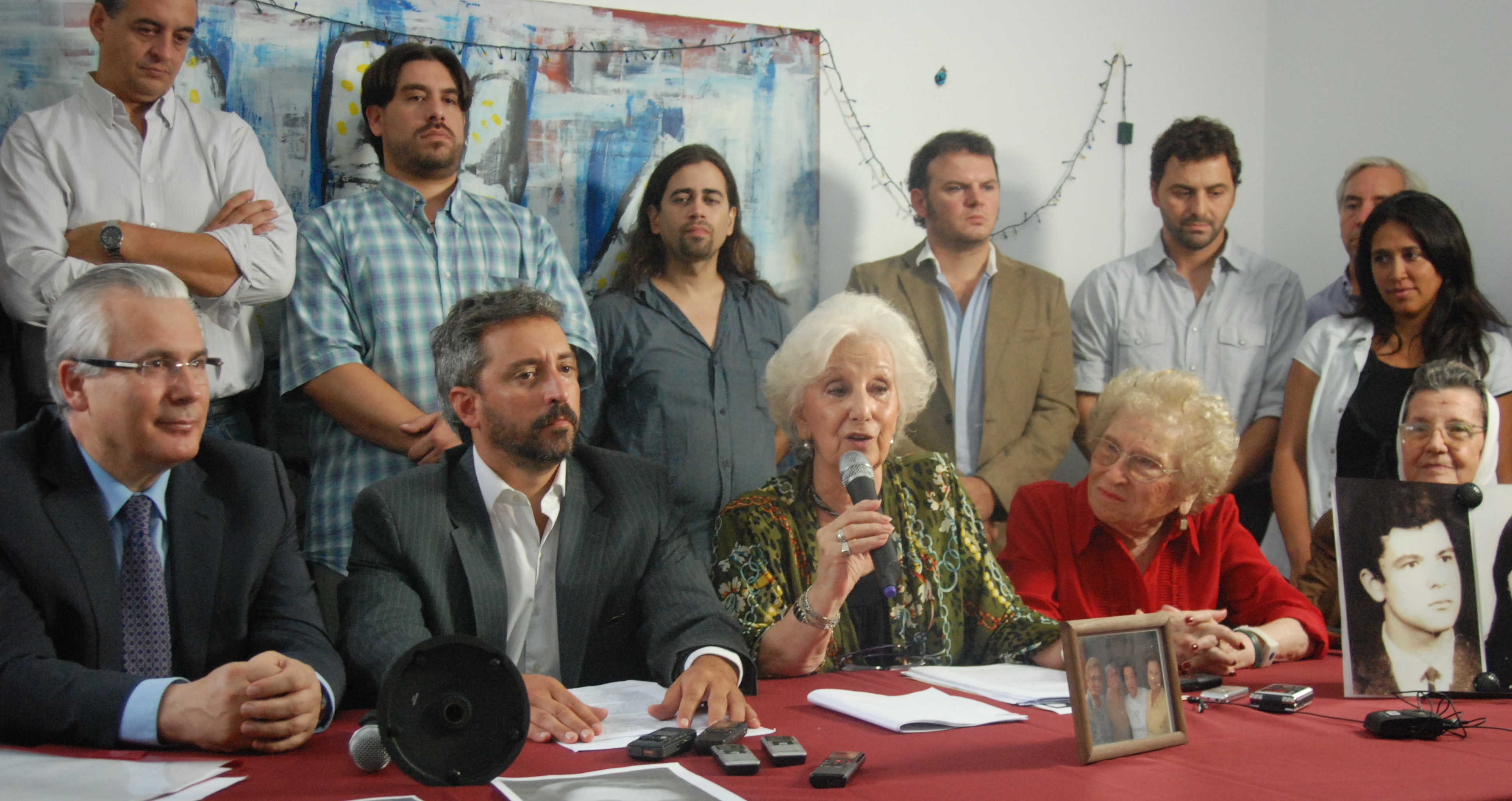 Participaron de la conferencia de prensa el secretario general de la Presidencia, Eduardo «Wado» de Pedro; el secretario de Derechos Humanos, Martín Fresneda; la candidata a diputada nacional Victoria Montenegro; el diputado Horacio Pietragalla; y las dos abuelas de la nieta restituida.