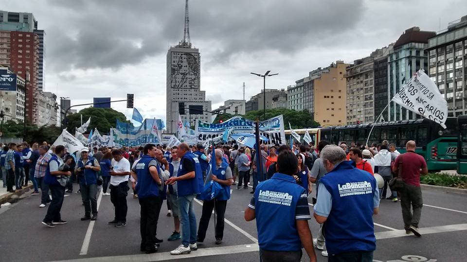 Bancarios que se movilizaron contra los despidos, principalmente en el Banco provincia y en el Banco Central, por el pase a planta permanente y mejoras en una paritaria sin techo, entre otros reclamos. De esta manera la columna llegó hasta la intersección de las dos avenidas en el microcentro porteño, donde se encontró con un fuerte operativo policial que impidió el avance hacia el Congreso.