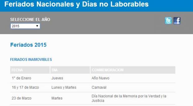 Durante 2015 habrá cuatro fin de semanas extendidos: El primero será el de Carnaval, los días 16 y 17 de febrero, que caerán lunes y martes respectivamente. Luego, viene el 24 de marzo, por el Día Nacional de la Memoria por la Verdad y la Justicia e incluye un puente turístico el lunes 23.