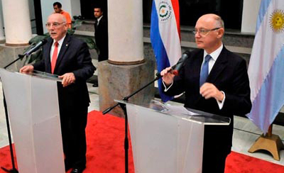 En el encuentro fueron considerados aspectos sobre el río Pilcomayo, la construcción del puente entre la capital guaraní y Clorinda; la necesidad de dinamizar la actividad de la Hidrovía Paraguay-Paraná; el dragado del río Paraguay; el tráfico vecinal fronterizo y la renovación del acuerdo bilateral para el uso pacífico de la energía nuclear. Destacaron los avances obtenidos en la I Reunión Binacional de Ministros y Gobernadores Paraguayos y Argentinos de la Frontera Común, realizada en Buenos Aires, el 14 de noviembre de 2013 y a la que asistió el doctor Gildo Insfrán e instaron a seguir trabajando para concretar los compromisos asumidos y desarrollar nuevas acciones en la II Reunión Binacional, que acordaron realizar en el mes de noviembre del año 2014, en Asunción. Asimismo, ambos cancilleres manifestaron su satisfacción por la celebración de los encuentros de los Comités de Integración existentes entre Paraguay y Argentina: Puerto Falcón – Clorinda, Encarnación – Posadas, Alberdi – Formosa, Pilar- Bermejo, Itá Corá – Itatí e Ayolas – Ituzaingó, que permitieron promover la integración fronteriza entre las localidades mencionadas en un amplio espectro de temas. Nuevos puentes En otro aspecto del encuentro, los responsables de la política exterior de los dos países destacaron asimismo la adjudicación de contratos para estudios de conectividad territorial de los Nodos Ñeembucú – Río Bermejo y Asunción – Clorinda, comprometiéndose a impulsar y priorizar las obras de infraestructura y a reunir al Grupo Técnico Mixto Paraguay-Argentina en el segundo semestre del 2014.  Al respecto, ambos Cancilleres anunciaron la intención de que la construcción del nuevo Puente Asunción-Clorinda sea financiada con recursos del Fondo de Convergencia Estructural del MERCOSUR. En relación al área fronteriza Puerto Falcón – Clorinda – Nanawa, instaron a las autoridades competentes de sus respectivos países a adoptar las medidas de control fronterizo pertinentes, considerando la necesidad de agilizar así como de optimizar el control del tráfico de personas y mercaderías, así como a mejorar la infraestructura existente. El dragado Asimismo, Timerman y Loizaga destacaron la conclusión de los trabajos de dragado del tramo compartido del Río Paraguay durante el periodo de estiaje del año 2013 y los avances para la elaboración de un nuevo programa de tareas para proseguir las actividades comprometidas durante el año 2014, en el marco del Acuerdo para la Regularización, Canalización, Dragado, Balizamiento y Mantenimiento del Río Paraguay, suscrito en Asunción el 15 de julio de 1969. Además, convinieron en la necesidad de elaborar el Estatuto de la Comisión Mixta Técnica Ejecutiva prevista en ese Acuerdo. Los puertos  Igualmente, examinaron los puntos de amarre debidamente habilitados que pueden servir a las embarcaciones paraguayas en el tramo argentino de la Hidrovía Paraguay-Paraná y exhortaron a las autoridades competentes de ambos países a llegar a un acuerdo sobre este punto. Coincidieron en la importancia de continuar con el alto grado de acercamiento existente entre las autoridades gubernamentales de ambos países, asumiendo el firme compromiso de proseguir con la búsqueda de soluciones conjuntas que posibiliten la mayor fluidez de la navegación de los ríos internacionales y faciliten el comercio exterior en el marco del fiel cumplimiento de las normas y estándares de seguridad en la navegación de la Hidrovía Paraguay-Paraná. El Pilcomayo Considerando los acuerdos alcanzados en la citada reunión de Ministros y Gobernadores de 2013 y recordando la necesidad de que ambos países intensifiquen sus esfuerzos en procura de atender adecuadamente la problemática del río Pilcomayo en sus diferentes aspectos, los Cancilleres instruyeron a sus Delegados ante la Comisión Binacional a reunirse a la mayor brevedad posible. Es para que consensúen las actividades conjuntas a ser encaradas en los próximos meses en relación al reparto equitativo de caudales y a la protección de puntos críticos en la cuenca inferior del río.  En dicho marco, se deberá avanzar en la institucionalización del organismo mediante la efectiva creación de sendas Secretarías en ambas Capitales, así como también en la negociación de los Acuerdos de Sede respectivos. Energía nuclear  Otro de los temas que convinieron, se relacionan con la decisión de iniciar, en la brevedad, la renegociación del Acuerdo sobre Cooperación en los Usos Pacíficos de la Energía Nuclear, suscripto el 20 de julio de 1967.  Para tal efecto, acordaron, que representantes de la Comisión Nacional de Energía Atómica de Paraguay realicen una visita a sus pares de la República Argentina el próximo martes 29 de abril. Asimismo, reiteraron la voluntad de sus gobiernos de combatir el tráfico ilícito de bienes culturales y, en tal sentido, con el propósito de proteger el patrimonio cultural de ambos países y establecer normas comunes que permitan la recuperación de bienes culturales, en los casos en que estos hayan sido robados, importados, exportados o transferidos ilícitamente, pactaron iniciar las negociaciones tendientes a la suscripción de un Acuerdo Bilateral contra el Tráfico Ilícito y de Recuperación de Bienes Culturales. Clorinda El Canciller paraguayo ponderó el accionar de la Aduana argentina en Clorinda en octubre de 2013 que incautó documentación sustraída irregularmente del país, lo que permitió recuperar documentos de alto valor histórico para la República del Paraguay; y agradeció su buen resguardo y entrega en el día de la fecha.