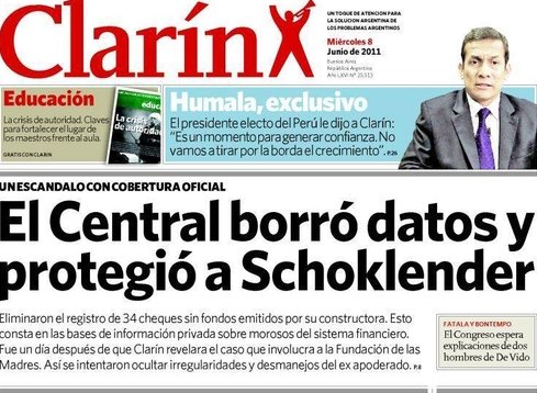 En la nota se expresa “El Banco Central eliminó datos que complicaban a Schoklender”. Luego de esto sigue: “Un día después de que Clarín informara el escándalo en la Fundación Madres de Plaza de Mayo, ordenó dar de baja de los listados de morosos 34 cheques impagos de Meldorek. En 2007 y 2008 se hizo lo mismo con cheques de las Madres.”Y continúa hablando de una supuesta orden “el 26 de mayo pasado la autoridad monetaria envió una orden para dar de baja de los registros de deudores 34 cheques impagos emitidos por Meldorek, que sumaban en total 1.591.681,1 pesos . Lo curioso es que en ningún lado consta que esos cheques (y la multa correspondiente) fueron saldados. Varios de los cheques son de un mismo talonario, presuntamente emitido por el Banco Supervielle. Ese banco es acreedor de Meldorek en $ 227.500, según consta en los registros del BCRA.”“La sugestiva orden que dio el Banco Central, organismo que preside Mercedes Marcó del Pont, luce irregular y suena a protección política, toda vez que los registros de cheques impagos deben quedar a la vista de quien consulta la base de datos, aún después de que se hayan saldado los cheques.”Sigue así a lo largo de la nota pero ya cerca del final señala la verdad de la situación “La ruta de la información crediticia para el caso de un cheque impago, es así: Al momento de que se registra un cheque sin fondos, el banco emisor debe informar al Banco Central el monto impago y el nombre y apellido y demás datos personales (DNI, CUIT) de quien libró ese cheque. El moroso en cuestión tiene 15 días para “levantar” el cheque y la multa correspondiente. Si efectivamente saldó la deuda antes de los 15 días, el banco tendrá dos días hábiles para dar de baja la infracción de la base de datos.”Esto que es sabido por cualquiera persona que opere con una cuenta corriente en cualquier banco de las República Argentina; es lo que salió a explicar Mercedes Marcó del Pont pero que Clarín disimuló en una nota interior.Es sabido que un titular catástrofe en un diario de tirada masiva y nacional cumple el objetivo de ser visto más por los que pasan por el quiosco y pegan un vistazo a las tapas de los diarios que por quienes compran el diario y luego leen la nota.Esta táctica como los zócalos en los programas de TN y los noticieros de los medios hegemónicos es una actitud a la que nos tiene acostumbrado Magnetto y compañía.En su esfuerzo por modificar la realidad para sostener sus beneficios, el grupo monopólico miente en nombre de un “periodismo independiente”.Olvidándose que no hay Periodismo Independiente lo que hay es Periodismo Comprometido, cuando Mariano Moreno creó la Gazeta de Buenos Aires lo hizo porque su compromiso con la Revolución de Mayo así se lo pedía, cuando Mitre fundó La Nación lo hizo porque su compromiso con su proyecto de país así se lo exigía y cuando Noble fundó Clarín lo hizo porque su compromiso con el proyecto desarrollista lo impulsaba.Lo que ninguno de esos periodistas comprometidos hacían era mentir poniendo un titular catástrofe que no se corresponde con la totalidad de la nota.
