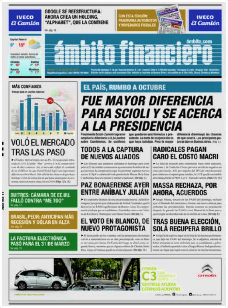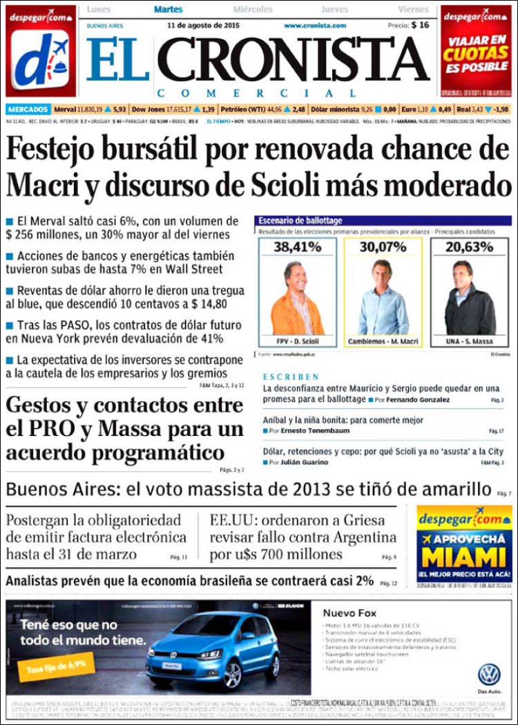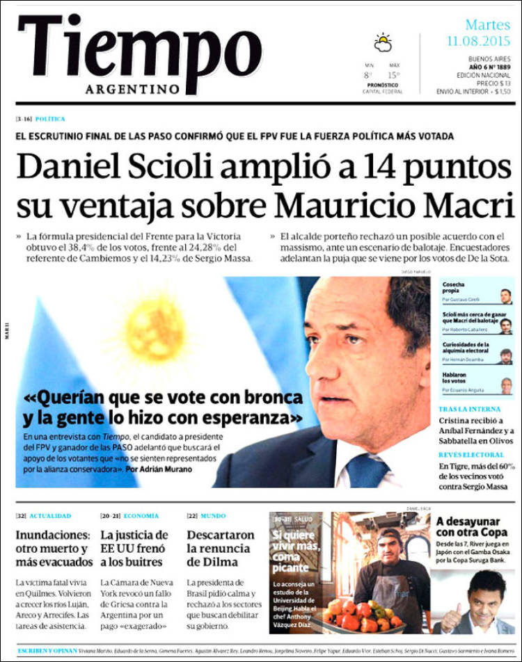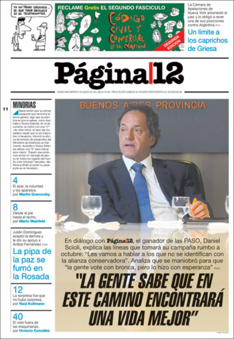“‘La gente sabe que en este camino encontrará una vida mejor’”, titula Página/12 al realzar las definiciones de Scioli, el ganador de las PASO. Adelanta a quién le hablará en octubre: “a los que no se identifican con la alianza conservadora”. Desde la foto central de Tiempo irrumpe el exmotonauta, quien también es entrevistado en una nota que se titula “Querían que se vote con bronca y la gente lo hizo con esperanza”.