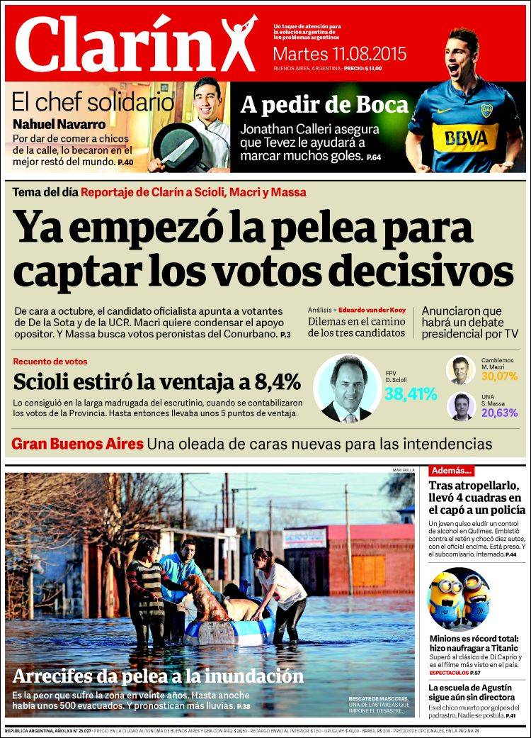 Clarín estampa hoy en lo más alto de su portada: “Ya empezó la pelea para captar los votos decisivos”. Al igual que el diario centenario, ofrece entrevistas con el trío electoral del domingo. Esos candidatos anunciaron que habrá un “debate” por TV, fija el gran diario argentino y Popular agenda en un espacio pequeño que se daría el 4 de octubre. Minimiza el tema de la ventaja más estirada a favor del actual gobernador.
