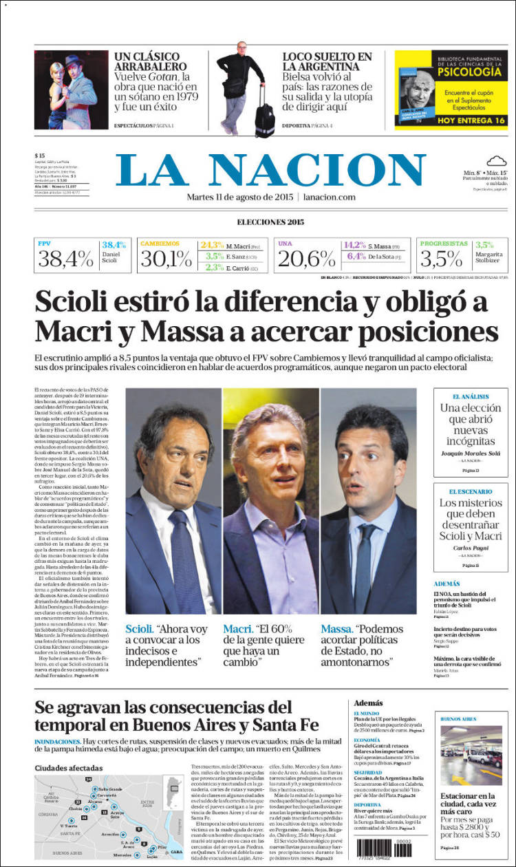 La noticia principal del día, para La Nación, tiene que ver con las estadísticas electorales del domingo: “Scioli estiró la diferencia y obligó a Macri y Massa a acercar posiciones”. Marca que el escrutinio “amplió a 8,5 puntos la ventaja que obtuvo el FpV sobre Cambiemos y llevó tranquilidad al campo oficialista”. Edita entrevistas con Daniel Scioli, Mauricio Macri y Sergio Massa, y aclara que el NOA fue el bastión que impulsó el triunfo del exmotonauta.