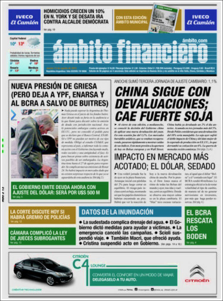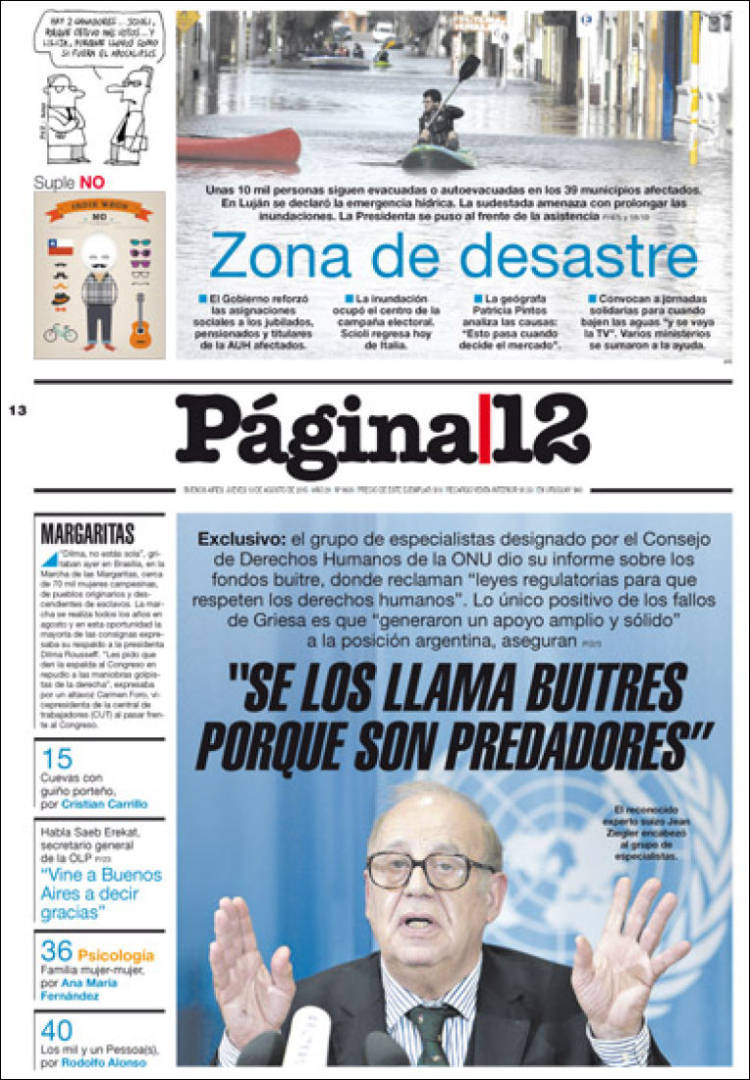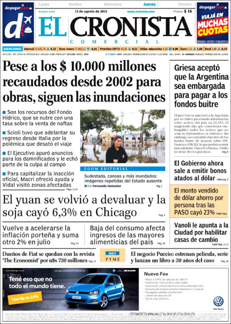 Dura tapa de El Cronista, que busca directamente alguna responsabilidad política: “Pese a los $ 10.000 millones recaudados desde 2002 para obras, siguen las inundaciones”. Explica que el dinero corresponde al Fondo Hídrico, “que se nutre con una tasa sobre la venta de nafta”. Hace hincapié también en el regreso anticipado de Scioli de Italia, en el ofrecimiento de “ayuda” de Macri y en los anuncios del Poder Ejecutivo para los damnificados. “Más gastos en Aerolíneas que en obras hídricas”, presenta La Nación en un pequeño recuadro de su tapa.