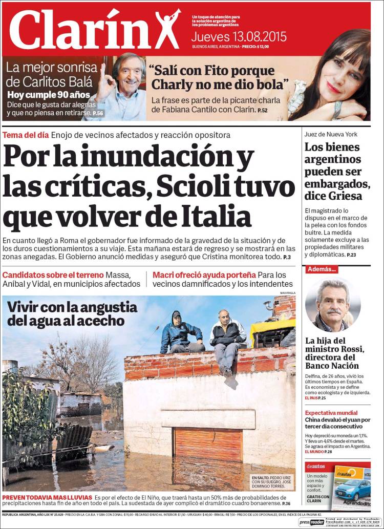 “Por la inundación y las críticas, Scioli tuvo que volver de Italia”, imprime Clarín en lo más alto de su edición impresa. Describe que cuando llegó a Roma le informaron de la “gravedad” de la situación y los “duros cuestionamientos” al viaje. Anticipa que se mostrará en zonas anegadas y que el Gobierno anunció medidas. Acompaña La Nación en un titular de menor envergadura. Tiempo aclara que el gobernador “suspendió su tratamiento médico en Italia” y que hubo “críticas” para el “oportunismo” de Mauricio Macri y María Eugenia Vidal.