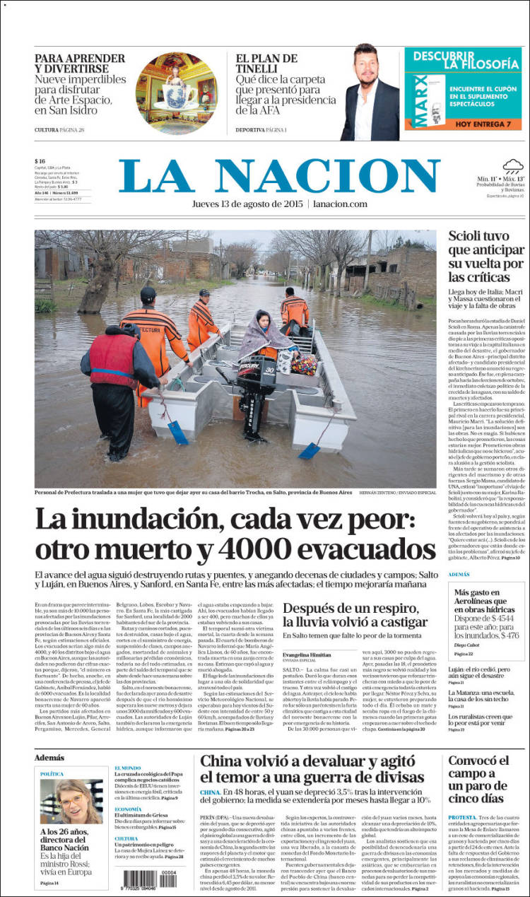 La Nación sigue atento al impacto del temporal de los últimos días: “La inundación, cada vez peor: otro muerto y 4000 evacuados”. El avance del agua destruyó “rutas y puentes”, consigna. Describe que Salto y Luján, en Buenos Aires, y Sanford, en Santa Fe, fueron las ciudades más afectadas.