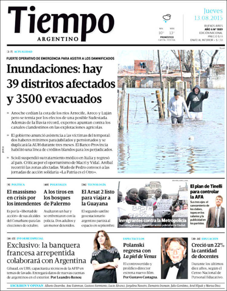 “Inundaciones: hay 39 distritos afectados y 3500 evacuados”, sostiene Tiempo Argentino al enfocarse en las ciudades de “Arrecife” (sic), Areco y Luján. Acentúa las medidas dispuestas por el Gobierno nacional y la línea de créditos ofrecida por el Banco Provincia. Crónica distingue una serie de historias “dramáticas” de la inundación en el título “Vivir bajo el agua”. Principalmente se basa en la situación de Luján.