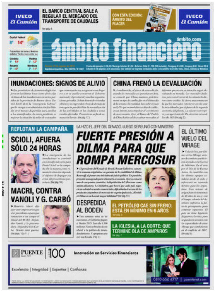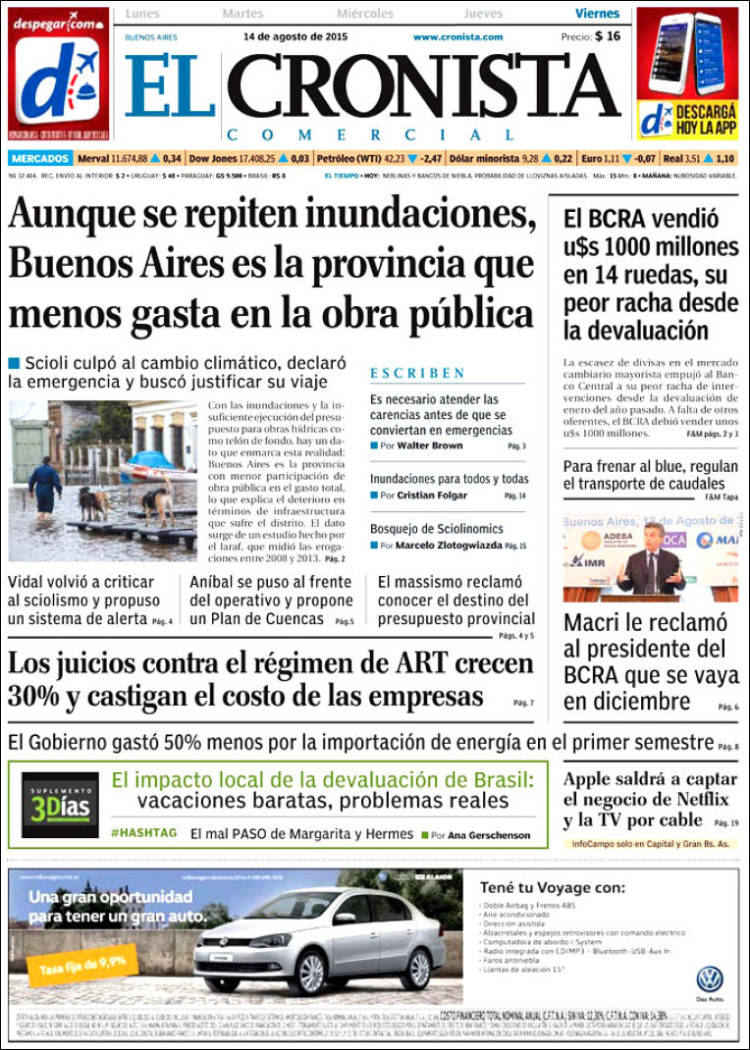 Otra tapa ácida de El Cronista, como la de ayer: “Aunque se repiten inundaciones, Buenos Aires es la provincia que menos gasta en la obra pública”. No sólo observa con atención la subejecución presupuestaria, sino también el discurso de Daniel Scioli, que “culpó al cambio climático, declaró la emergencia y buscó justificar su viaje”. Mira especialmente la lucha dialéctica entre los candidatos María Eugenia Vidal, Aníbal Fernández y los aspirantes massistas.