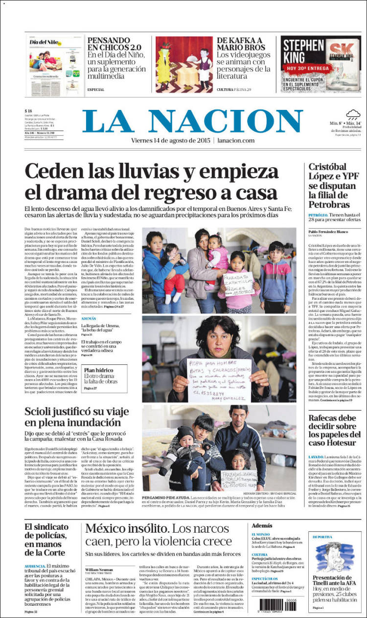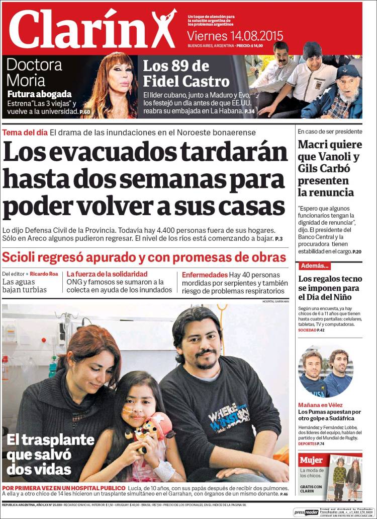 “Los evacuados tardarán hasta dos semanas para poder volver a sus casas”, pronostica Clarín en el techo de su edición impresa según el discurso de Defensa Civil. Informa que todavía hay 4.400 personas fuera de sus hogares.
