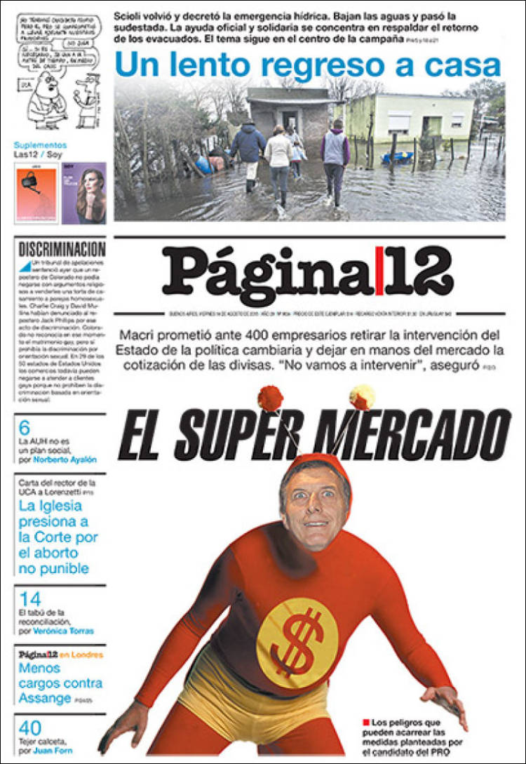 Página/12 ofrece un fotomontaje: en el cuerpo del Chapulín Colorado coloca la cara de Mauricio Macri bajo el título “El súper mercado”. Realza que el líder del PRO “prometió ante 400 empresarios retirar la intervención del Estado de la política cambiaria y dejar en manos del mercado de cotización de las divisas”.