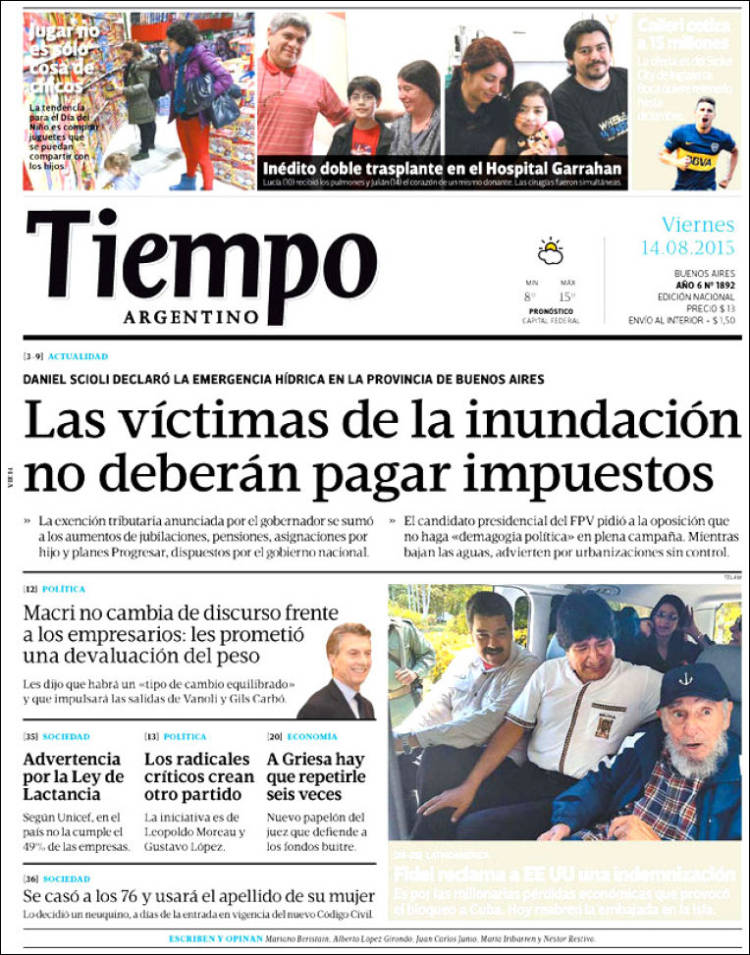 La solidaridad se gana el primer plano de Popular: “Bajan las aguas, crece la ayuda”. Prevé que habrá “alivio” para los inundados y contabiliza aún 2 mil evacuados y 4 mil autoevacuados. Da la noticia de una muerte en Navarro y un desaparecido en Lobos. “Las víctimas de la inundación no deberán pagar impuestos”, consigna Tiempo en su título principal tras el anuncio del gobernador Scioli. También impacta el pedido para que “la oposición” no haga “demagogia política”.