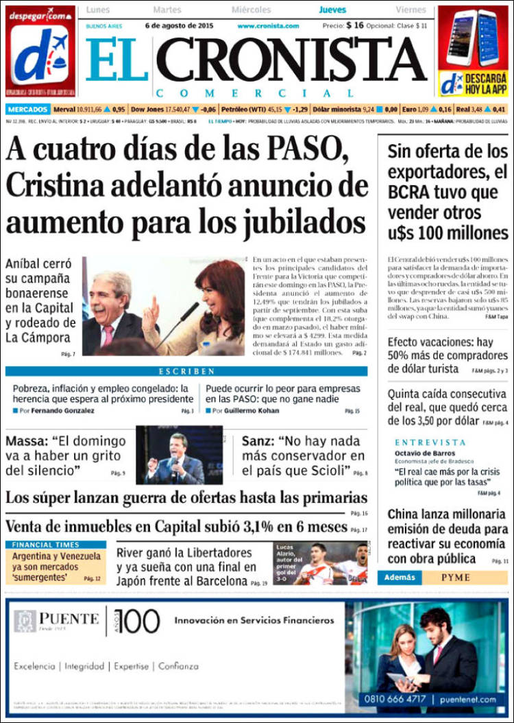 Sólo Ámbito y El Cronista siguen de cerca los últimos pasos de los candidatos presenciales más importantes. El diario fundado por Julio Ramos anuncia que Mauricio Macri, Daniel Scioli y Ernesto Sanz cerrarán hoy sus campañas. El matutino salmón exhibe textuales de Sanz y Sergio Massa, en lo que se deduce que son entrevistas exclusivas.