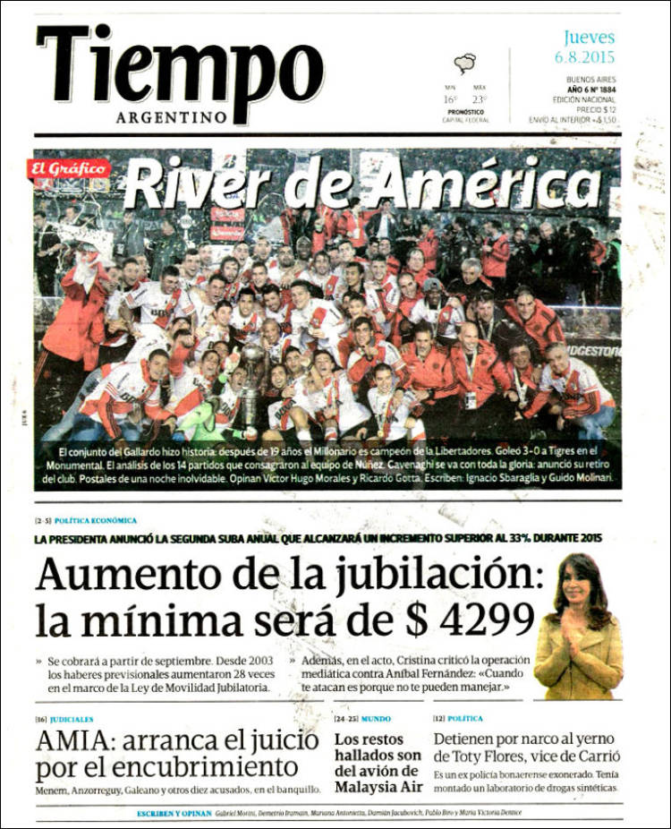 El otro tema que instala Cristina Fernández se puede observar en la cima de tres matutinos. “Con 33 de mano”, celebra Página/12 al distinguir que la Presidenta anunció que las jubilaciones aumentarán un 12,49% a partir del 1° de septiembre. El alza anual ya representa el “33,03%”, registra. Y sostiene que el mínimo ahora sube a $ 4299 mientras que la media quedó fijada en $ 7662. “Aumento de la jubilación: la mínima será de $ 4299”, consagra Tiempo Argentino en el otro título principal de la jornada después del protagonizado por el River campeón de América.