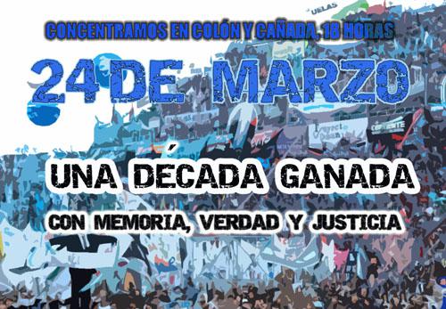 Desde las 12, los argentinos marcharán hacia Plaza de Mayo, en donde se habrá de realizar un acto del que participarán organismos de derechos humanos y organizaciones sociales y políticas, en el marco del 38° aniversario del último golpe de Estado. A partir de las 17, en el Espacio Memoria y Derechos Humanos (ex ESMA) -Av. Del Libertador 8151, CABA-, se celebra el 10° aniversario de la recuperación del predio donde funcionó la Escuela de Mecánica de la Armada durante la última dictadura cívico militar. Allí se señalizará el ex Centro Clandestino de Detención, Tortura y Exterminio con los tres pilares de Memoria, Verdad y Justicia. Posteriormente, se inaugurará la Casa por la Identidad de las Abuelas de Plaza de Mayo. El cierre del acto convocado bajo la consigna «Un pueblo con Memoria es Democracia para siempre», estará a cargo de diversas bandas como La Bersuit, Los Pericos y el Dúo Coplanacu, entre otros. Previo al acto, la Secretaría de Derechos Humanos, a través del Archivo Nacional de la Memoria (ANM), convocó a participar de una vigilia que se iniciará esta noche hasta las 3.10 de mañana, hora en que la junta militar emitió por cadena nacional su primer comunicado golpista 38 años atrás. Octubres Convoca: Concentración a Plaza de Meyo El próximo lunes 24 de marzo se conmemorarán 38 años del golpe cívico-militar propiciado por la junta militar, la oligarquía y los grupos económicos que instauró a sangre y fuego el modelo neoliberal en la Argentina. A partir del año 2003, con los gobiernos de Néstor y Cristina, con el proyecto nacional y popular en curso, dicha fecha ha recobrado el valor que se merece en la búsqueda de memoria, verdad y justicia. No sólo por las políticas de derechos humanos que se han llevado adelante, a través de las cuales se esclarecieron causas por crímenes de lesa humanidad, enjuiciamiento y condena de los genocidas y la recuperación de la identidad de los bebes apropiados, sino también por el avance en el nivel de conciencia y movilización popular que ha llevado cada aniversario a llenar de memoria, mística y sueños la plaza del pueblo. Hacía 38 años, la oligarquía le quiso poner fin al proceso de industrialización que había sentado sus bases durante el peronismo. Le quiso poner fin al Estado de Bienestar. Le quiso poner fin al movimiento obrero organizado, que tenía los trabajadores mejores pagos de América Latina. Pero sobre todo, le quiso poner fin al nivel de organización del campo popular, y es por ello que hoy recordamos a los 30.000 compañeros detenidos-desaparecidos. Hoy, podemos decir que muchos de los sueños de esa generación maravillosa se vienen realizando con el Proyecto Nacional que conduce nuestra querida Presidenta y que sembró Néstor un 25 de mayo de 2003. Como dice Hebe, una madre de todos nosotros, hoy más que nunca tenemos que reivindicar a aquellos compañeros que dieron la vida por una Argentina más justa, libre y soberana. No aflojemos, sigamos adelante, con más fuerza cada día, con memoria y proyección en aras de construir una Patria para todos, liberada definitivamente de las corporaciones económicas. Con los trabajadores y los más humildes organizados, movilizados en la calle, defendiendo lo conquistado, con Cristina hasta la victoria. Por una Argentina potente. Concentramos en Avenida de Mayo y 9 de Julio a las 11:00 horas. Nahuel Silva, Secretario de la Organización, Octubres Frente Grande: Convoca a Plaza de Mayo Este 24 de marzo nos movilizamos, como todos los años, por Memoria, Verdad y Justicia. Convocamos en el punto de cita de la Corriente Nacional de la Militancia a concentrar a las 12 hs en Piedras y Av de Mayo para movilizarse desde allí. Javier Pablo Hermo, Presidente Frente Grande Unidos y Organizados Córdoba: Colón y Cañada a las 18:00hs. 24 de marzo “Una década ganada, con memoria, verdad y justicia”