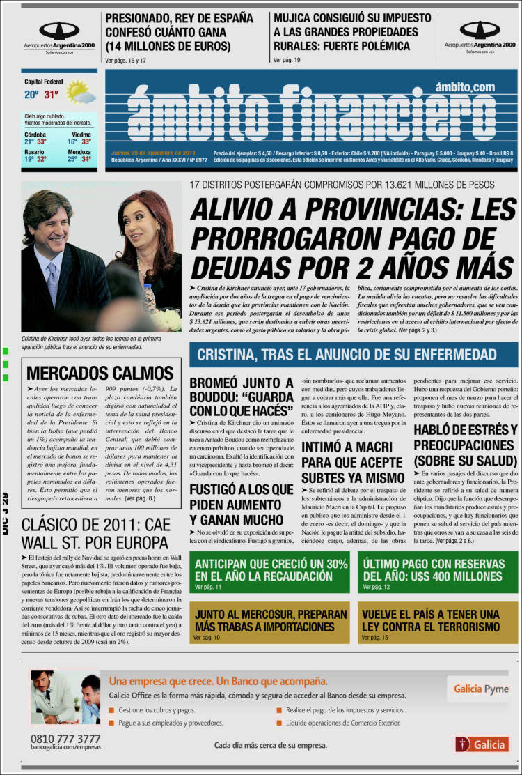 Los diarios especializados en economía ponen énfasis en el acuerdo de la Presidenta con gobernadores por la refinanciación de deudas de 17 provincias con la Nación. Ambito expone “Alivio a provincias: les prorrogan pago de deudas por 2 años más”, y detalla que “17 distritos postergarán compromisos por 13.621 millones de pesos”. Además, Ambito edita cuatro títulos secundarios para exponer ejes del discurso presidencial: “Bromeó junto a Boudou: ‘Guarda con lo que hacés’”, “Fustigó a los que piden aumento y ganan mucho”, “Intimó a Macri para que acepte subtes ya mismo”, y “Habló de estrés y preocupaciones (sobre su salud)”.