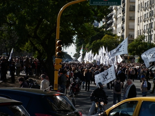 Esta movilización en su apoyo se llevó adelante desde las 14 cuando se hizo la audiencia de conciliación en el 5to piso de Carlos Pellegrini 1175. Allí cientos de personas de todas las edades esperaron la salida de Víctor Hugo con carteles alentadores y en repudio al grupo Clarín.