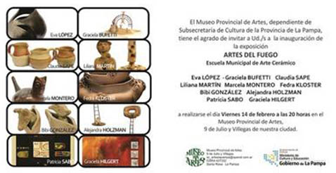 El viernes 14, en el Museo Provincial de Artes (Santa Rosa), desde las 20:00 horas se inaugurará la eexposición «Artes del Fuego», conformada por obras de ceramistas de la Escuela Municipal de Arte Cerámico de la ciudad de Santa Rosa.Exponen: Eva López, Graciela Bufetti, Claudia Sape, Liliana Martín, Marcela Montero, Fedra Kloster, Bibi González, Alejandra Holzman, Patricia Sabo y Graciela Hilgert. La muestra se suma a «Tres artistas del lugar», donde participan Susana Machado con vitrofusión, Juan Ricardo Wiggenhauser (tapices) y Osmar Atilio Sombra (óleos). Cabe destacar que la entrada es libre y gratuita y que los horarios de atención son de lunes a viernes de 08:00 a 13:00 horas y domingo, de 19:00 a 22:00 horas.