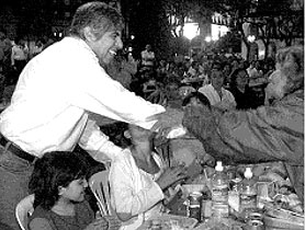 En el año 2000, Hugo Moyano, titular de la central sindical disidente, señaló que el gobierno «debe cambiar el modelo económico y crear puestos laborales» para enfrentar la desocupación que afecta a más de cuatro millones de personas.El dirigente le pidió a Dios que «ilumine a los gobernantes, para que tomen decisiones que mejoren la situación de los argentinos».Moyano estuvo acompañado por los dirigentes Julio Piumato (judiciales) y Juan Manuel Palacios (UTA), y el sacerdote Luis Farinello, quien bendijo los alimentos y rezó por que todos los argentinos tengan «pan y trabajo».Durante ese año, la desocupación había superado la frontera establecida en 1995 en la crisis del «Tequila». En diciembre de 2000 había 4.088.000 personas con problemas laborales, 377 mil más que en 1999.El presidente Fernando de la Rúa, consideró por aquellos días que «los datos son alentadores y derrotan los pronósticos pesimistas que decían que el desempleo iba a subir».Días antes del acto de la CGT en Plaza de Mayo, y luego de haber acordado el «megacanje» de deuda, el Primer Mandatario había emitido un mensaje navideño optimista de cara al 2001 que fue criticado por la central obrera disidente y por distintas organizaciones sociales.Doce meses después, con un país sumergido desde lo económico y lo social, se produjo la caída del gobierno de la Alianza, luego de dos jornadas de violencia y saqueos que dejaron un saldo de 39 muertos en todo el país. iba a subir».