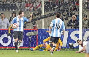 A los 37 y con un pelotazo al vacío de Fernández (de gran tarea en defensa), Lavezzi picó hasta el fondo, tiró el centro bajo e Higuaín no perdonó para el 1 a 1. El pipita agarró rápido la pelota en clara señal de querer buscar la victoria, aunque el partido estaba inclinado en favor de Perú.