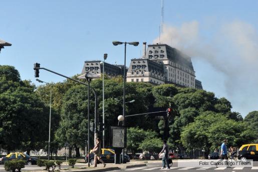 Una intensa columna de humo negro sale de de los pisos superiores del edificio Libertador que se quedó sin luz y comenzó a ser evacuado.