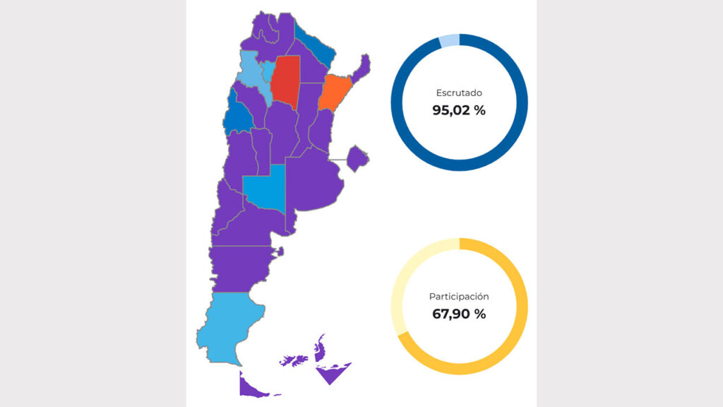 Con más del 95% de mesas escrutadas, LLA alcanzó 40,81% en la elección de Diputados, mientras que Fuerza Patria rondó 31,6%. A la vez, el oficialismo ganó en 6 de las 8 provincias que renovaban Senado y se impuso en 16 distritos a nivel nacional. En Buenos Aires, la boleta encabezada por Diego Santilli obtuvo 41,53% frente al 40,84% del peronismo.
