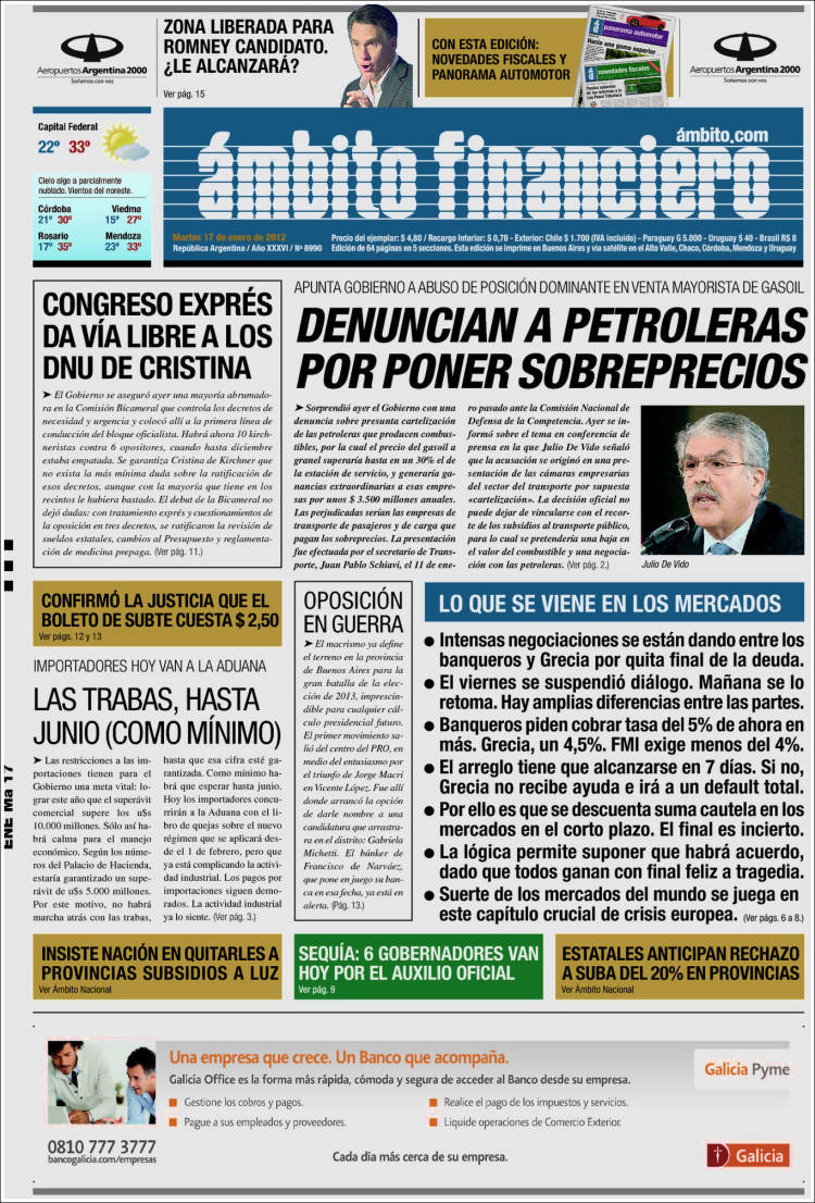 Ambito, con el título “Denuncian a petroleras por poner sobreprecios” también destaca la “posición dominante” que el Gobierno le imputa a las empresas y comparte con Clarín que “La decisión oficial no puede dejar de vincularse con el recorte de los subsidios al transporte público”, pero amplía que así “se pretendería una baja en el valor del combustible y una negociación con las petroleras”. Para El Cronista, “El Gobierno embiste contra petroleras y denuncia que venden más caro el gasoil”; y advierte que “Suena el cascabel cuando es hora de cortar subsidios”.