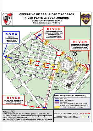 Hoy a las 19 se disputará el encuentro futbolístico entre los equipos de River Plate y Boca Juniors en las instalaciones del Club Atlético River Plate, del barrio de Nuñez.El servicio de seguridad dispuesto para la ocasión comienza a implementarse a las 9:30 y se extenderá hasta aproximadamente las 21:30, cuando se concrete la total desconcentración del público asistente.La apertura de las puertas del estadio está prevista para alrededor de las 15 y durante ese día no habrá venta de entradas.Los cortes de tránsito se implementarán al comienzo del servicio se seguridad (9:30) quedando vedado el tránsito vehícular por las avenidas Figueroa Alcorta y Udaondo, lo mismo que el puente Labruna.Será restringuido el acceso a todo el denominado Barrio River, delimitado por las avenidas del Libertador, Udaondo, Figueroa Alcorta y Monroe.La policía recomienda a los asistentes al evento portar la menor cantidad de elementos (como mochilas, bolsos, etc) u otros elementos que podrían ser considerados peligrosos (encendedores, botellas plásticas, desodorantes, envases plásticos de todo tipo, etc), con los cuales no se podrá ingresar al estadio.Las medidas tiene por objeto agilizar la tarea del personal policial en los puntos de cacheo y control.La parcialidad de Boca sólo ingresará por la avenida Lidoro Quinteros, mientras que la parcialidad de River lo hará por Udaondo y por Figueroa Alcorta (acorde al sector que indique su ticket)Los teléfonos para el operativo son:COMISARIA 51º (Teléfonos: 4687-6478/ 4784-9940)DIVISION PRENSA POLICIA FEDERAL(4370-5953)